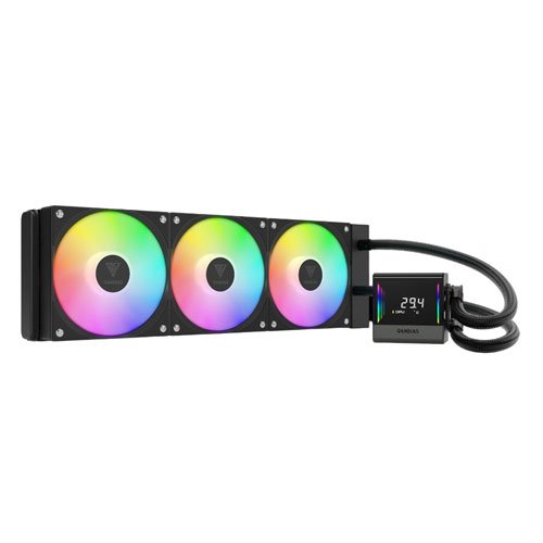 The GAMDIAS Chione E4 360 is a premium all-in-one liquid CPU cooler engineered for high-performance systems, offering a perfect combination of cooling efficiency, modern aesthetics, and real-time system monitoring. Designed with a 360 mm aluminum radiator and three 120 mm ARGB PWM fans, it delivers exceptional airflow and heat dissipation to maintain optimal CPU temperatures under heavy workloads, gaming, or overclocking. The fans operate at 800–1800 RPM, providing up to 73.36 CFM of airflow with minimal noise, ensuring a quiet yet powerful cooling experience.