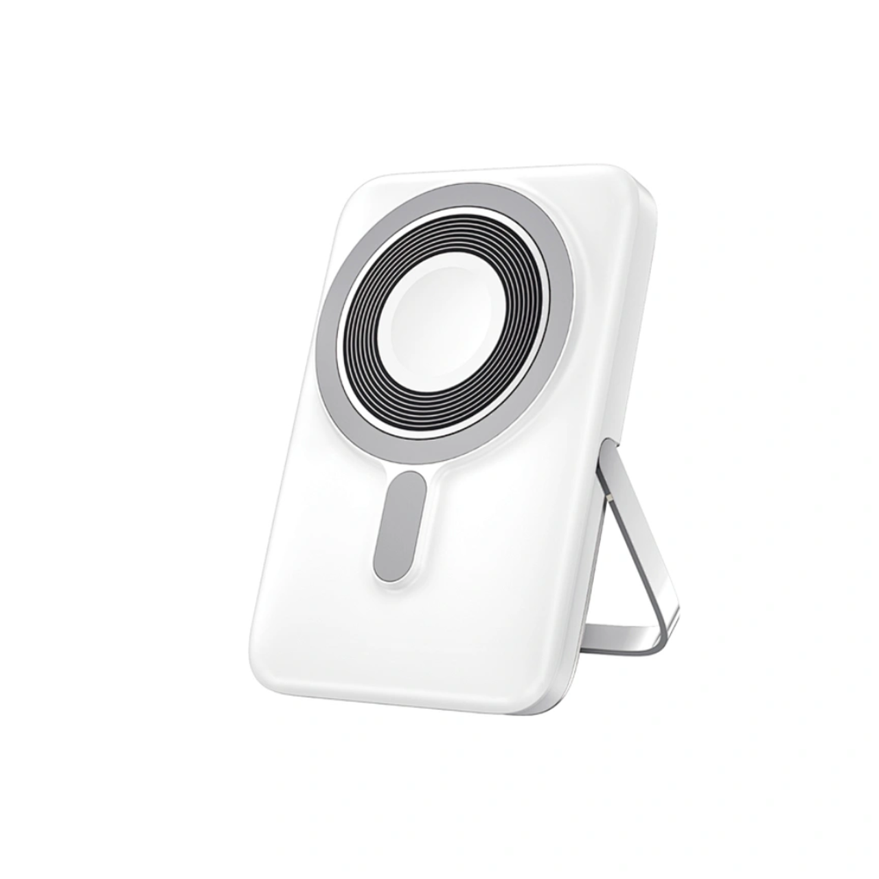 What sets it apart is its 3‑in‑1 capability: it supports MagSafe‑style magnetic wireless charging (up to ~15 W) for a compatible phone, while also accommodating a smartwatch and wireless earbuds at the same time. The built‑in foldable zinc‑alloy kickstand elevates its utility, letting you prop up your phone—ideal for video calls or watching content while charging. A digital battery‑level display helps you easily monitor remaining power, so you’re never guessing how much juice is left.
